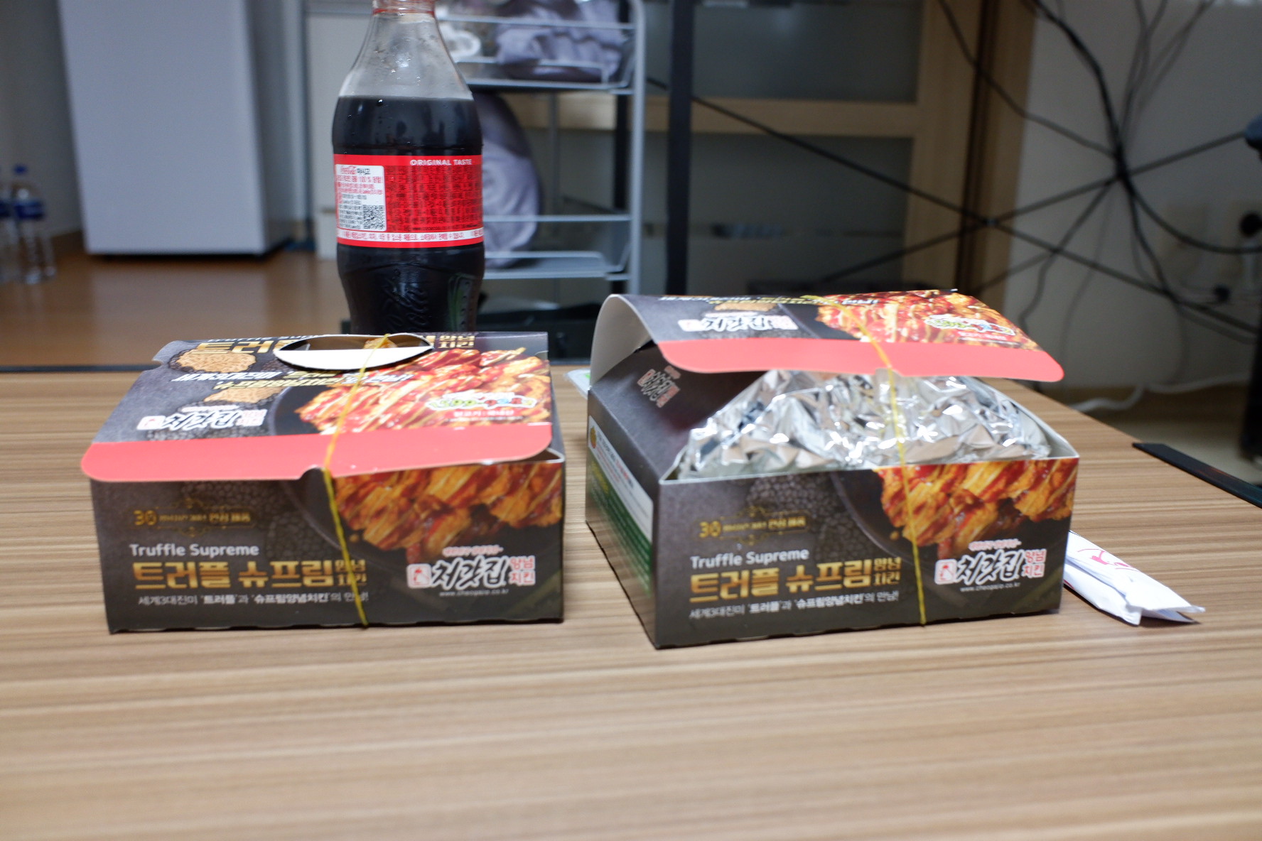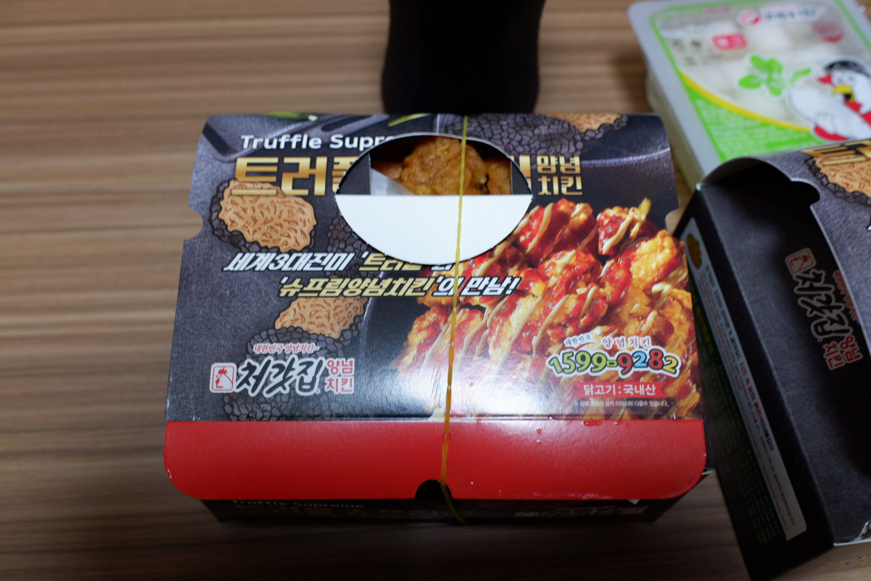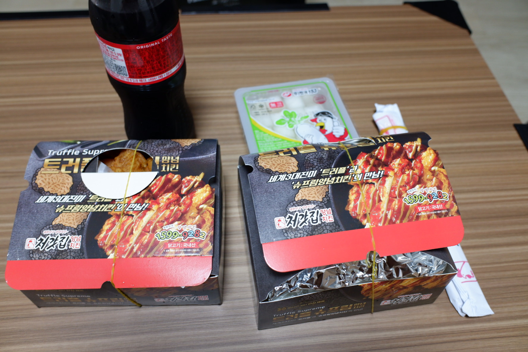 콜라도 서비스이고요. 왼쪽은 후라이드 오른쪽은 양념입니다.