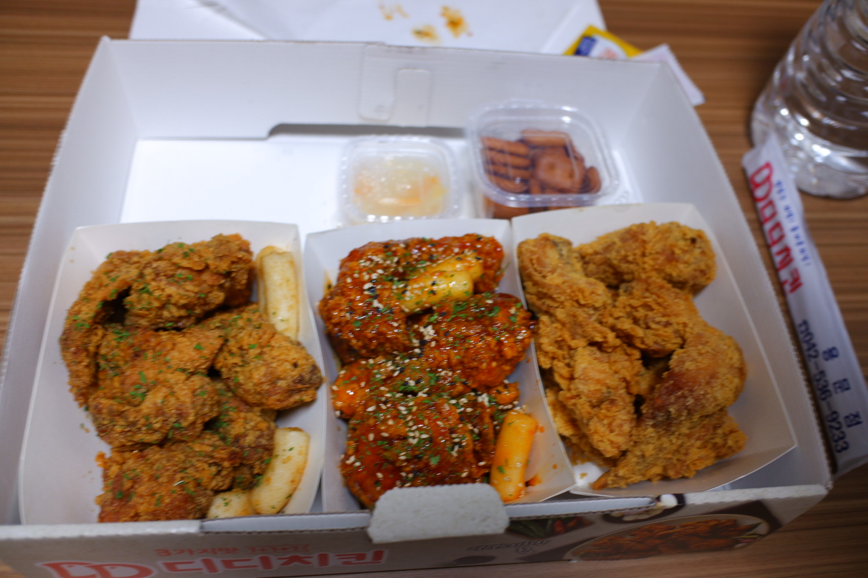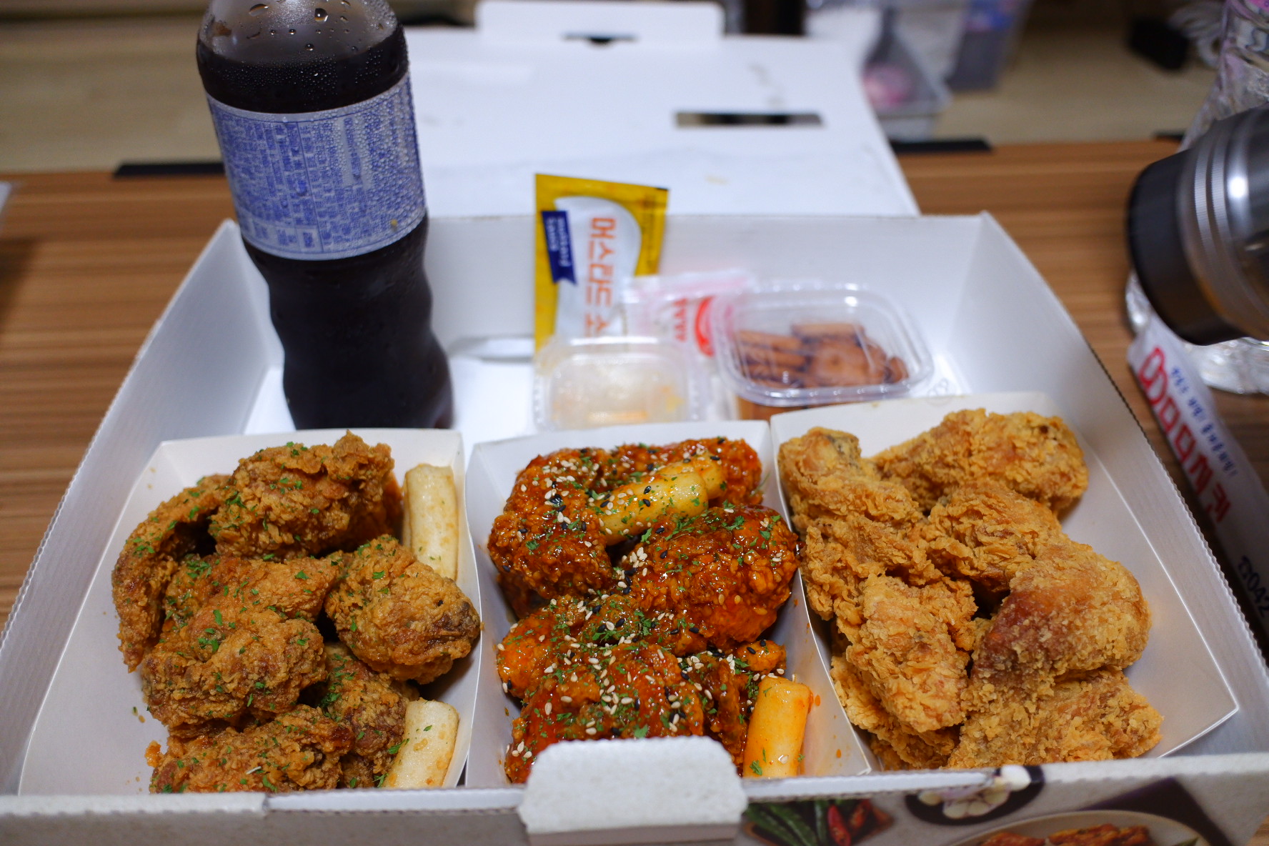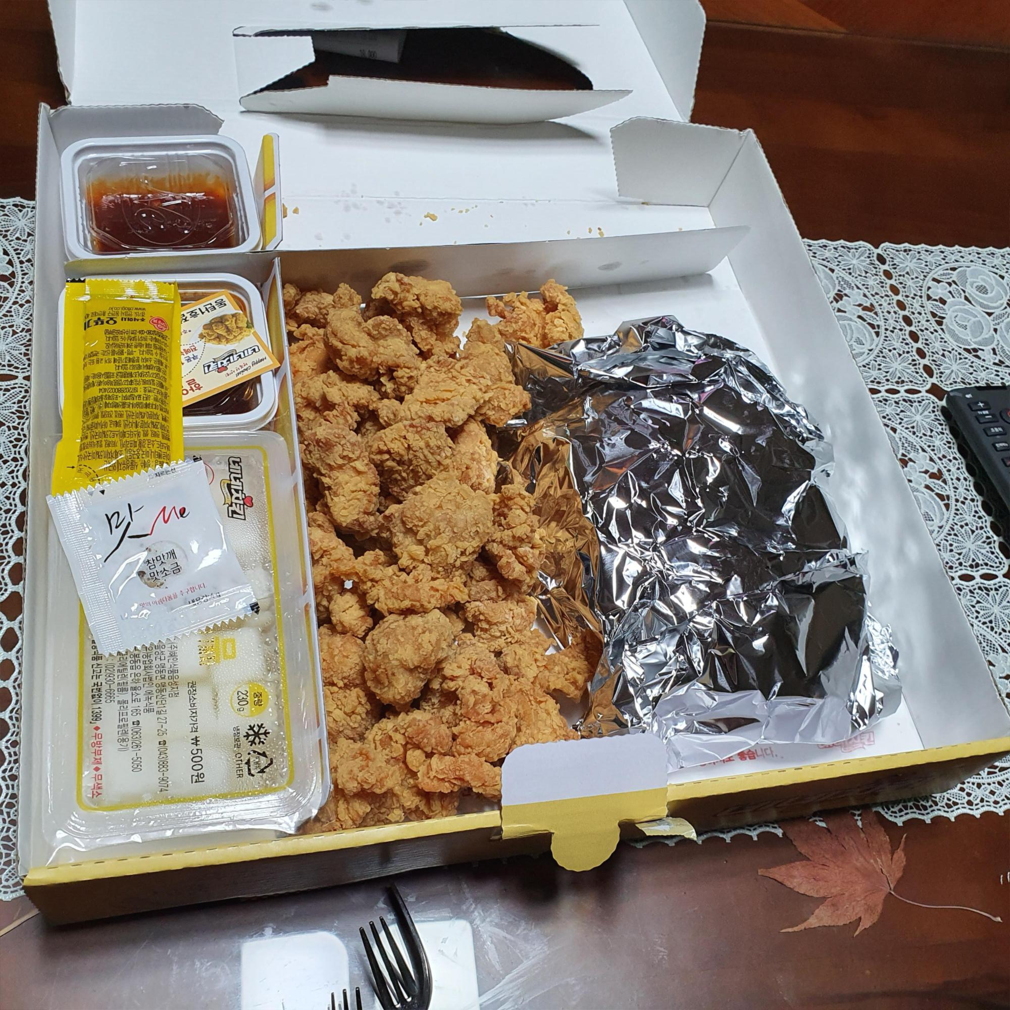 초점이 흔들리긴 했네요, ㅠㅜ 맛은 왼쪽이 간장이고 가운데가 양념, 오른쪽이 아마 후라이드였던거 같아요. 이곳은 떡도 넉넉하게 튀겨주고, 맛도 좋고 양도 많았어요.