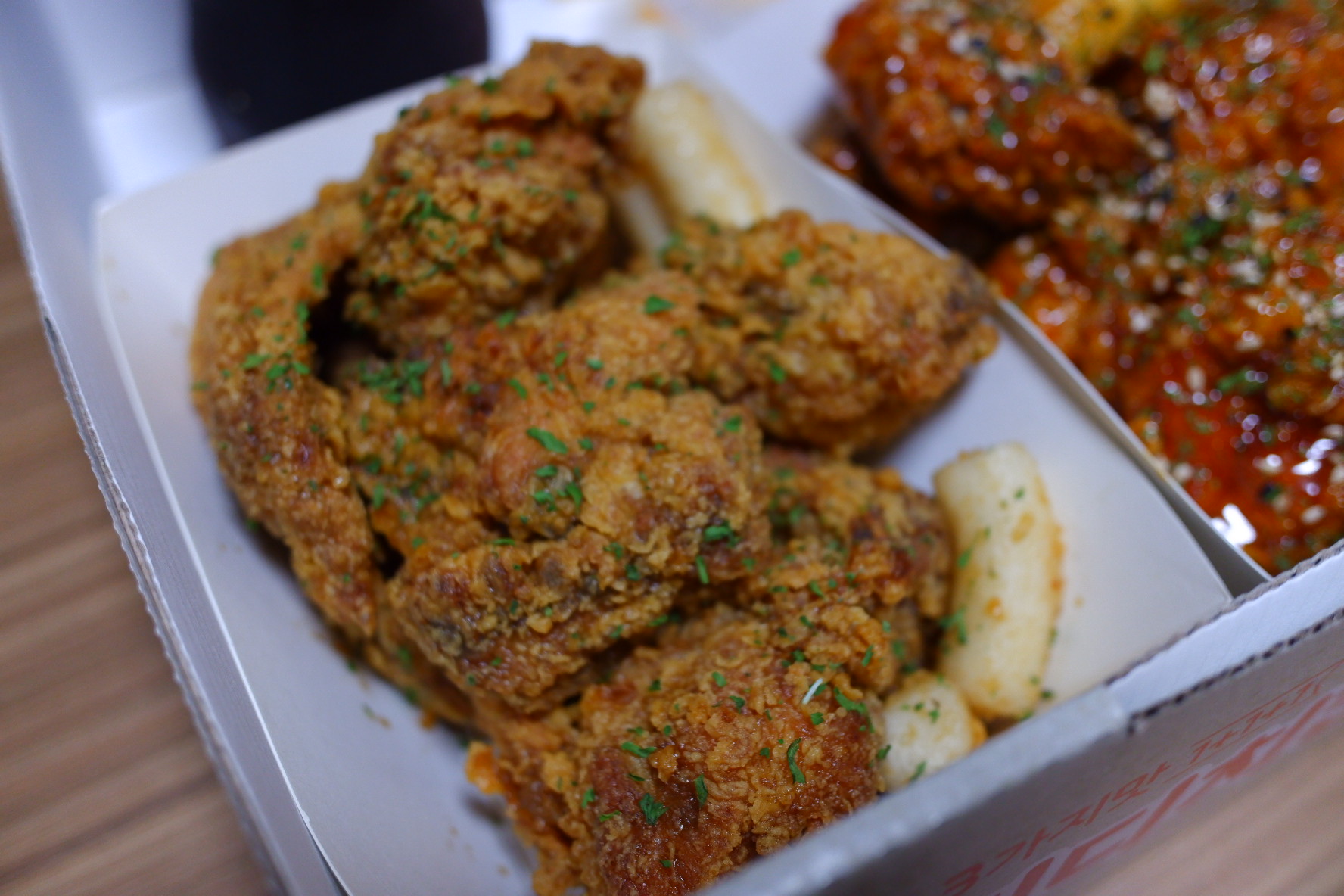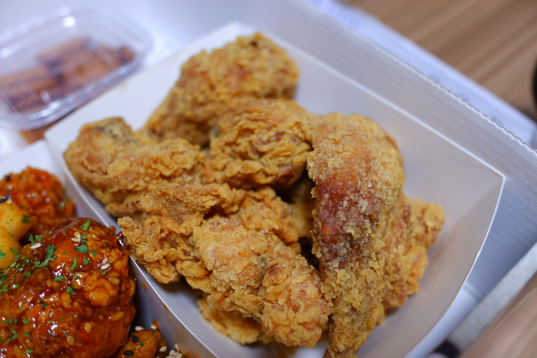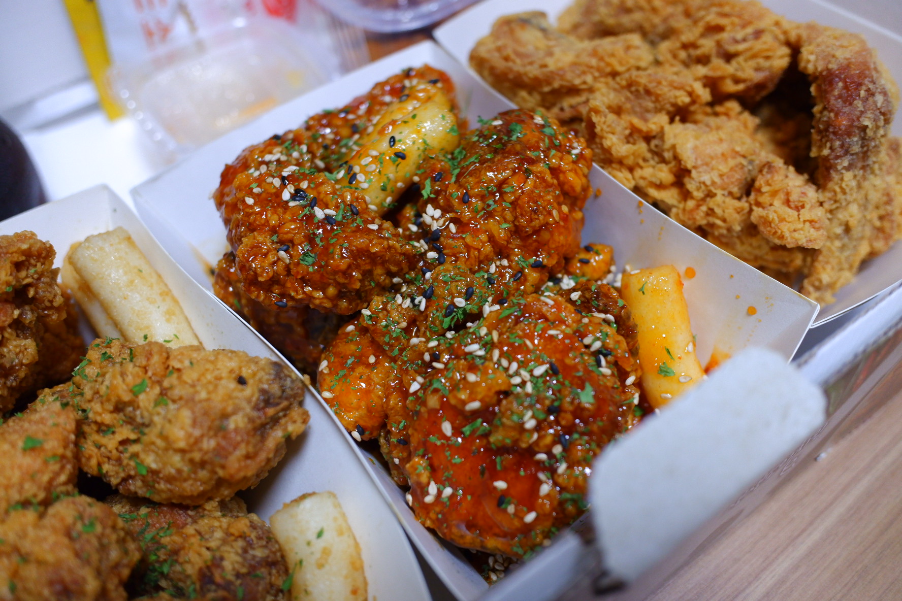 초점이 흔들리긴 했네요, ㅠㅜ 맛은 왼쪽이 간장이고 가운데가 양념, 오른쪽이 아마 후라이드였던거 같아요. 이곳은 떡도 넉넉하게 튀겨주고, 맛도 좋고 양도 많았어요.
