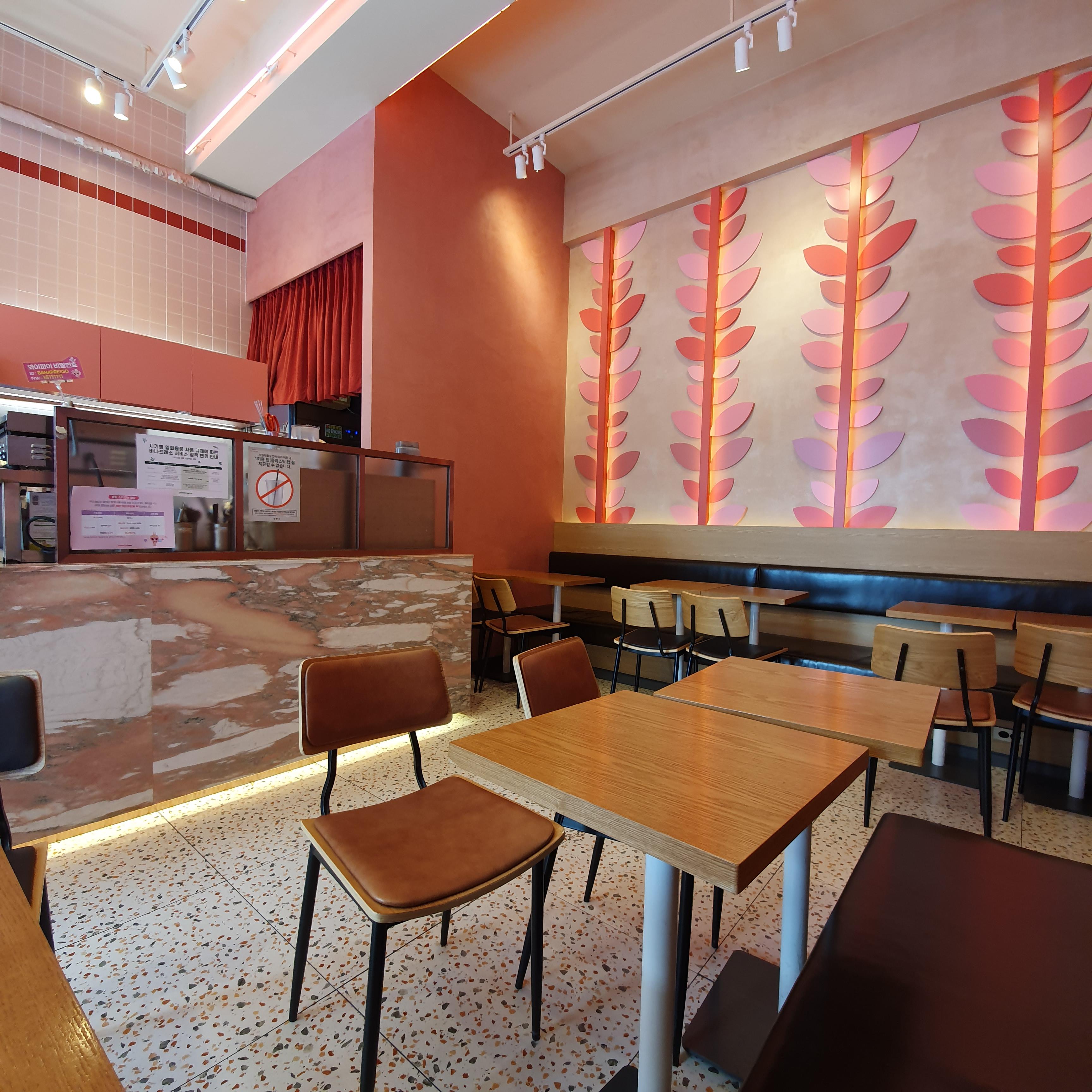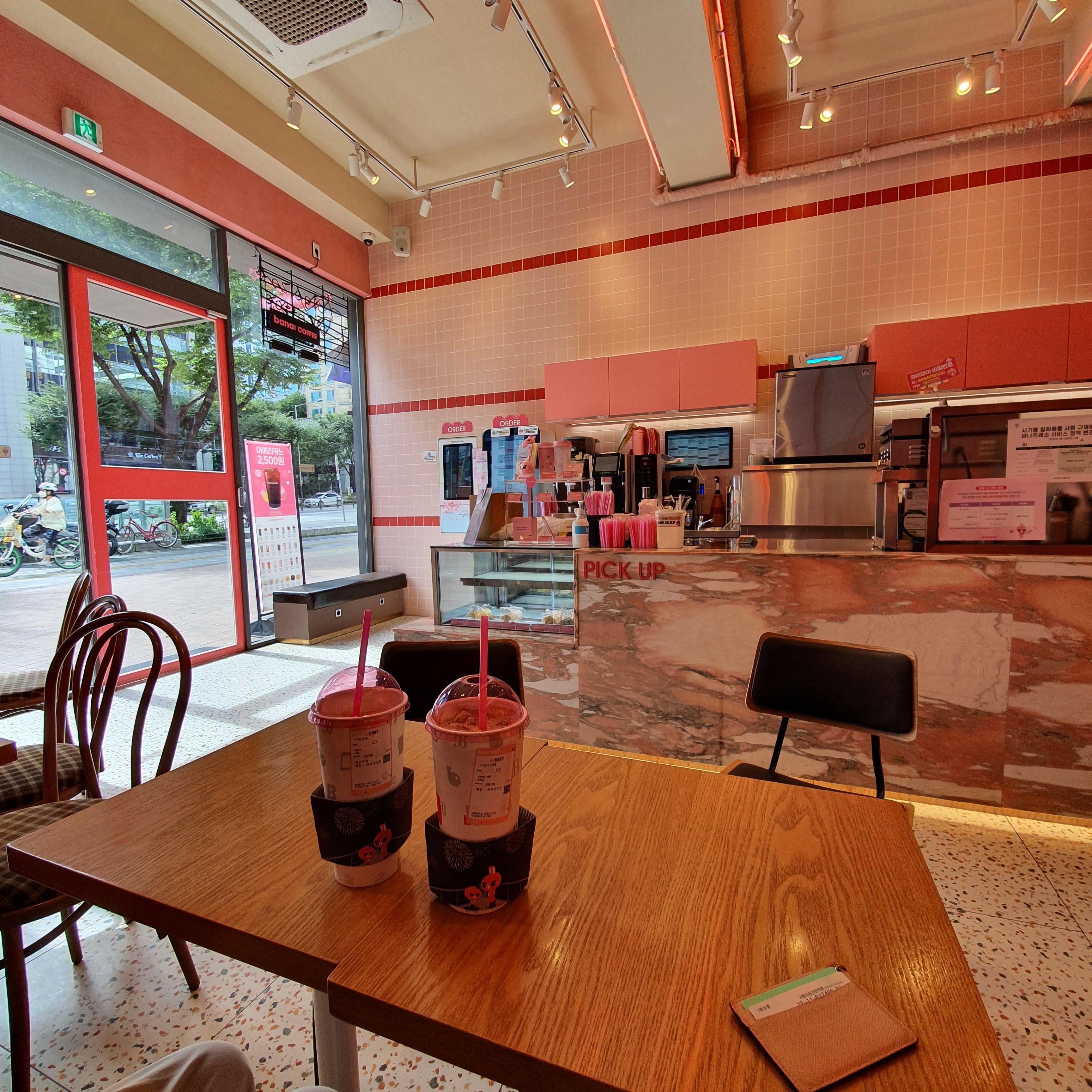 내부는 핑크핑크한 느낌으로 인테리어가 되어 있고 층고가 높은게 특징이더라고요. 가능하면 복층도 가능할거 같은데 ㅋㅋ 자리는 그렇게 많지 않아서 아쉽도라고요. 하지만 이곳은 강동역 근처에 오피스가 밀집된 지역이라 그렇게 큰 영향은 없을 거 같기도 했어요