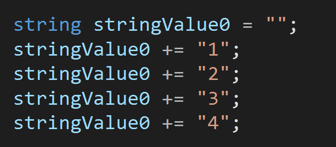 아래 코드는 많은 사람들이 습관적으로 사용하는 코드입니다. 이렇게 사용하게 되면 기존 스트링 변수에 다른 변수를 추가하고 할당하는 과정이 반복적으로 일어나게 됩니다. 이런 코드가 여러번 호출되면 성능상 문제가 발생할 수 있어요. 따라서 이런 방법은 최대한 사용을 하지 않는게 좋아요.