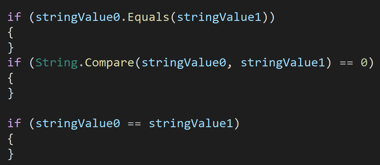 일반적으로 같다는 "==" 다르다는 "!=" 이런식으로 많이 사용하는데요. 이 방법보다는 Equals 함수나 Compare 함수를 사용하는 것을 추천합니다. 특히 "==" 이나 "!=" 함수는 사용하지 않는게 좋아요. 이유는 string는 Reference 타입이기 때문이죠. 해당 내용은 아래 포스팅에서 확인할 수 있습니다.