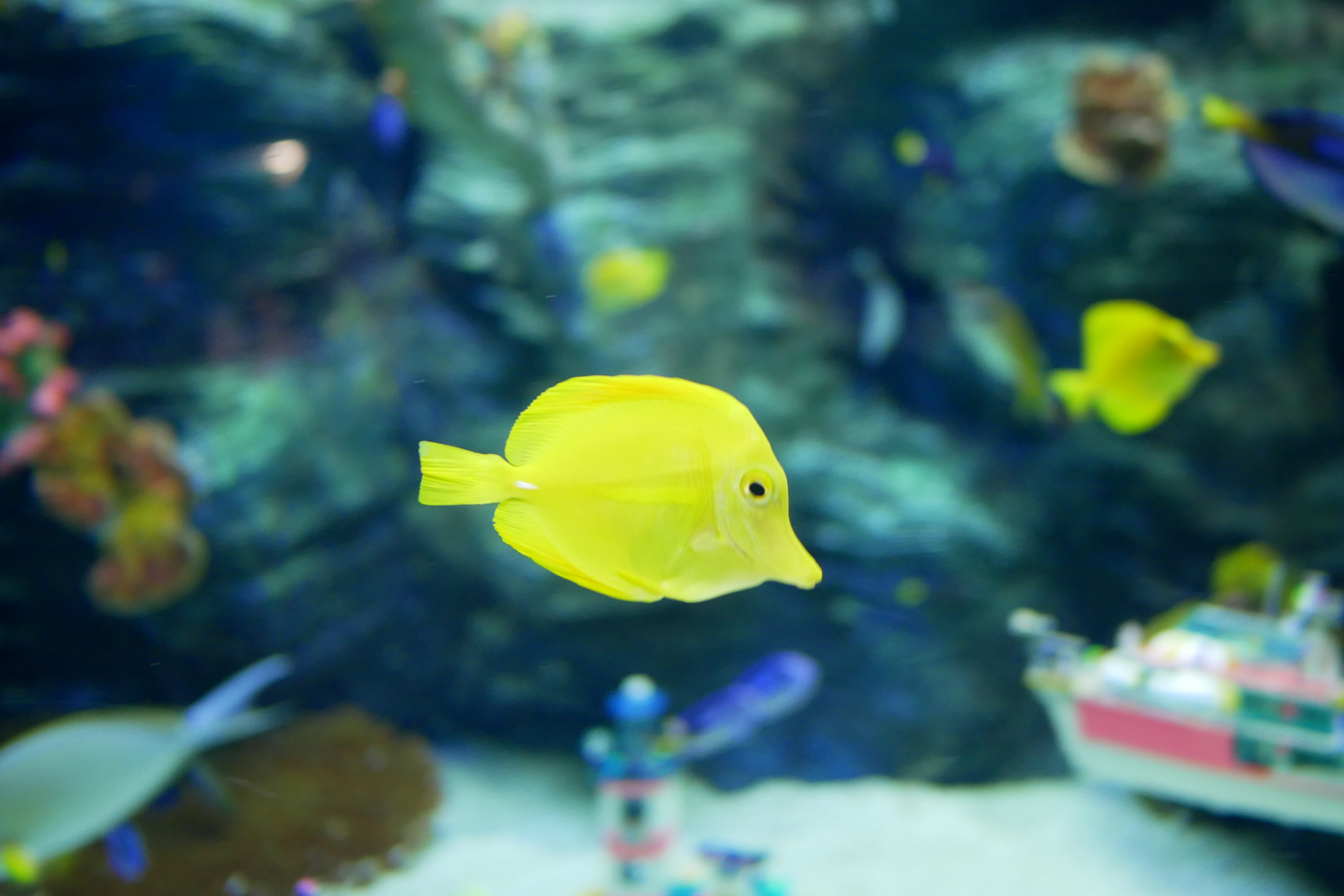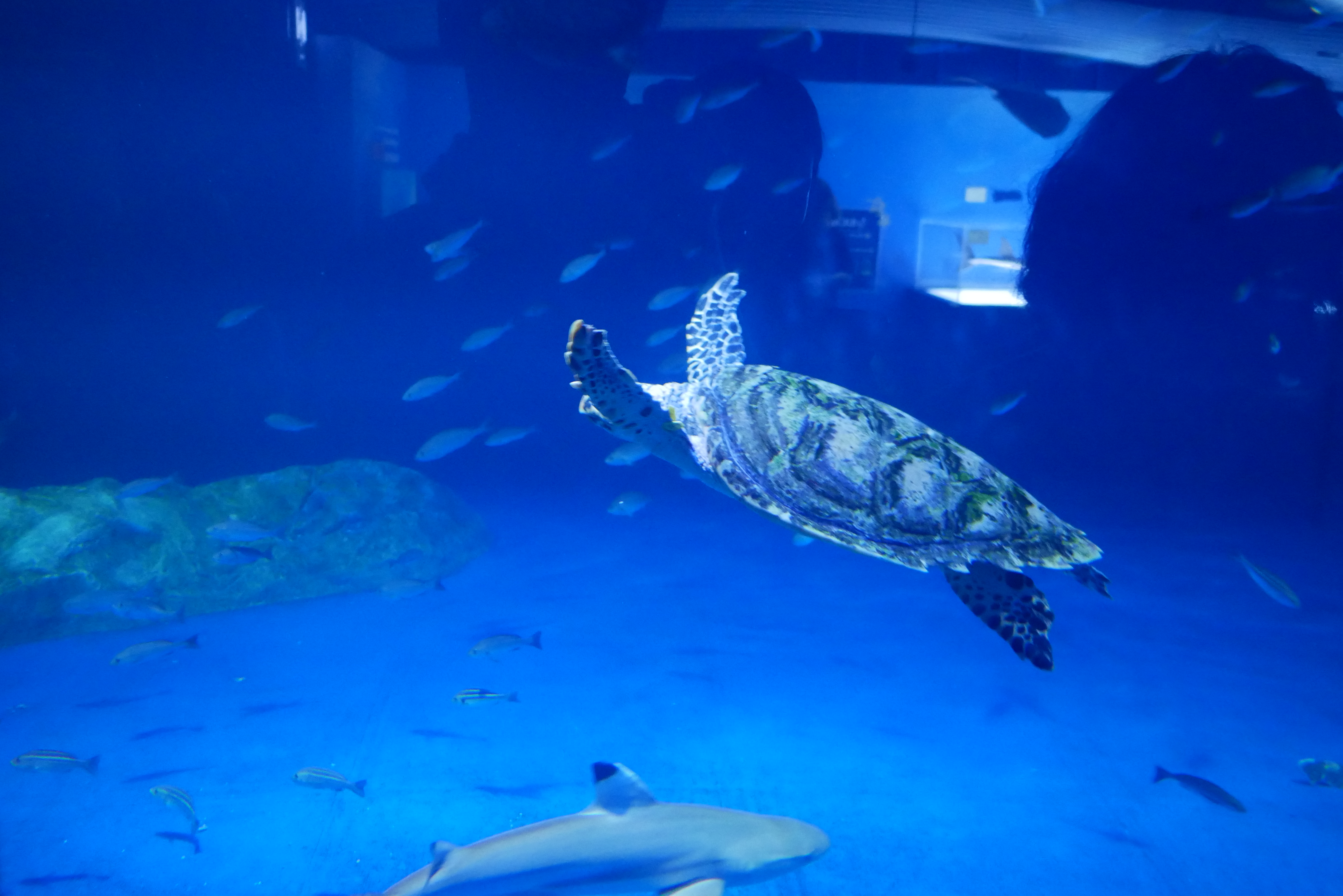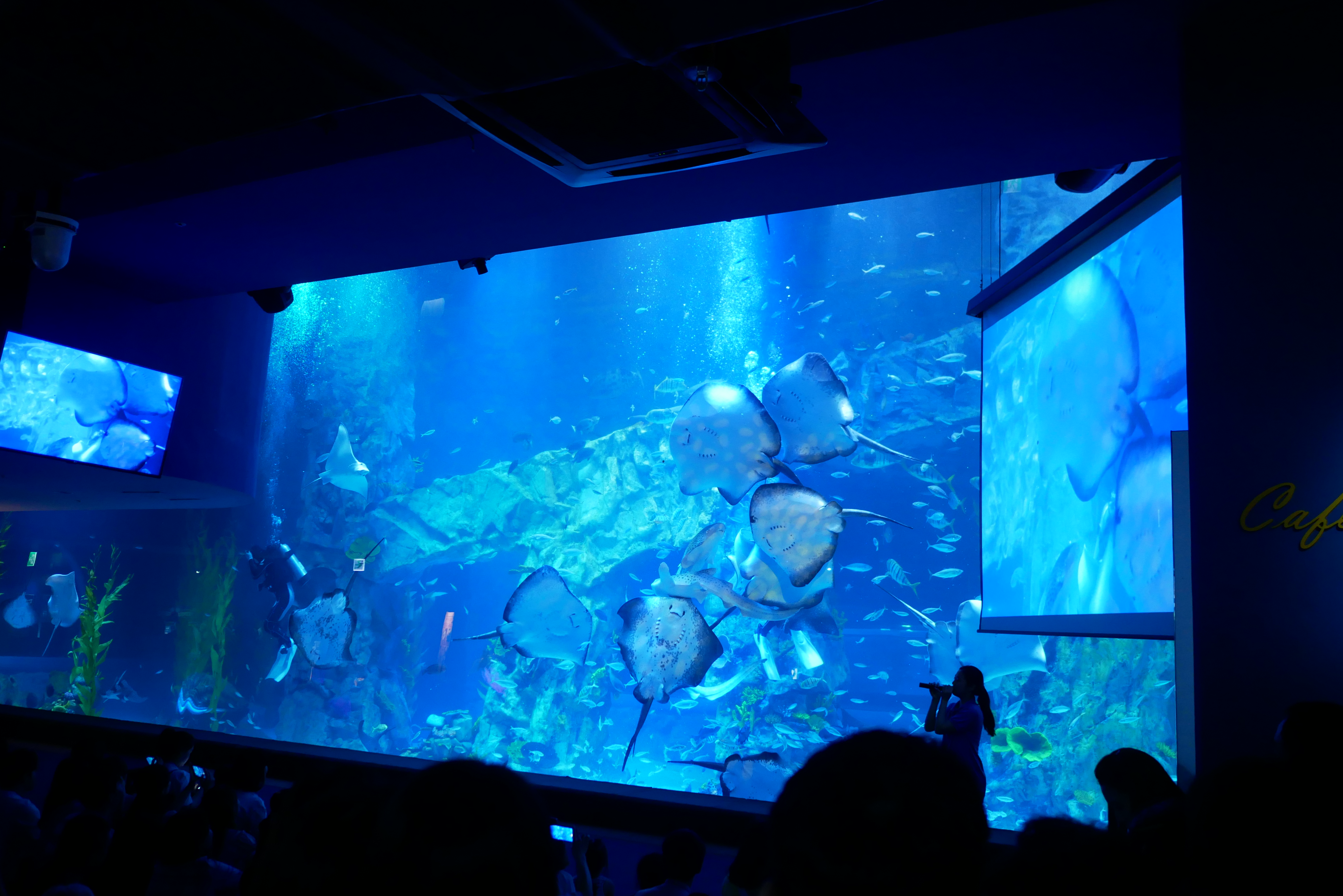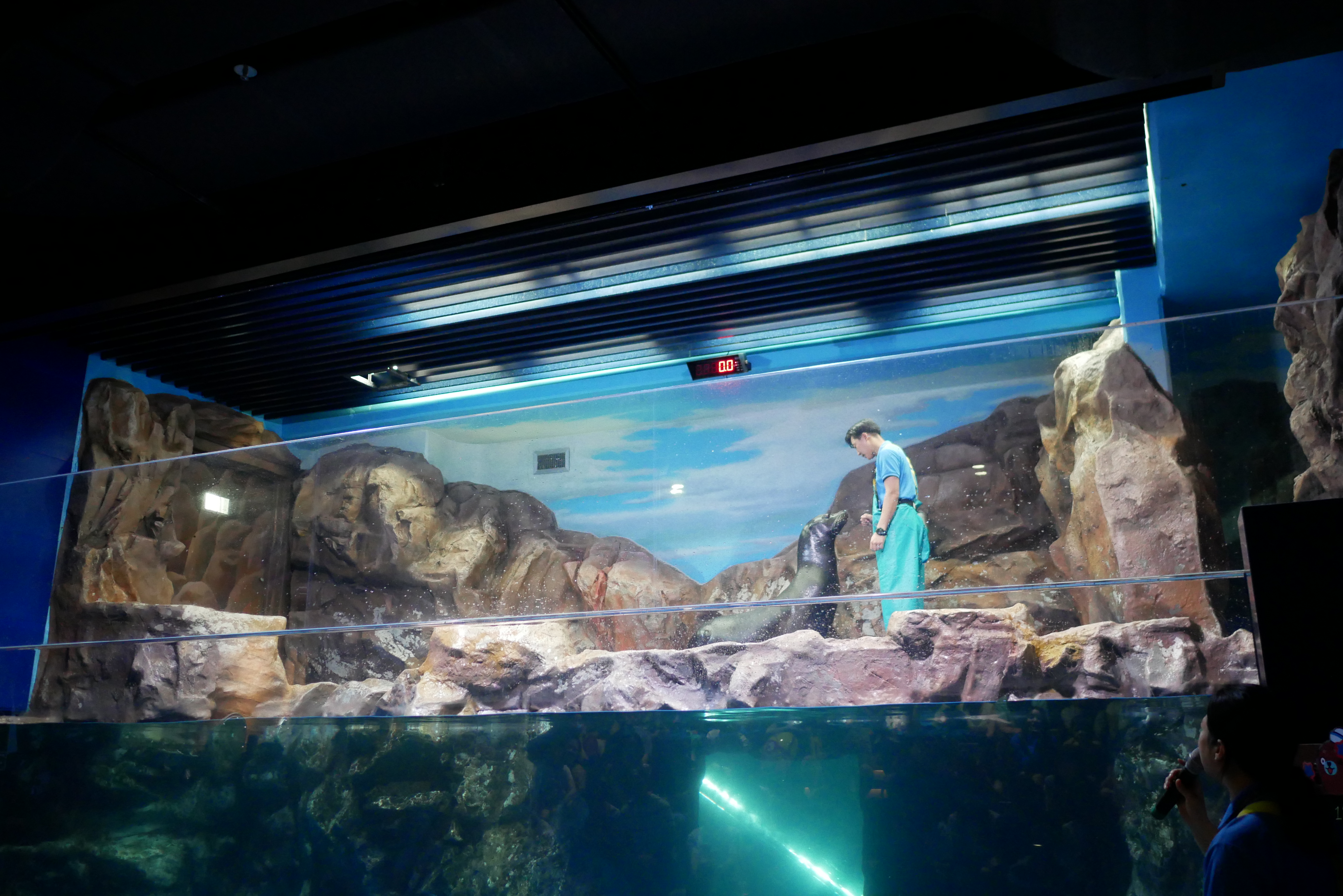 그리고 이곳의 메인 수조는 2개가 있는데요. 하나는 아쿠아리스트가 들어가서 물고기에게 밥을 주면서 같이 체험할 수 있는 수조와 벨루가가 있는 수조인데요. 벨루가는 심해 고래입니다. 색이 하얀색이고 매끈한 피부를 갖고 있기 때문에 사람들한테 인기가 많이 있습니다. 제가 알기로 3마리였는데, 한마리가 죽은 것으로 알고 있어요. ㅠㅜ