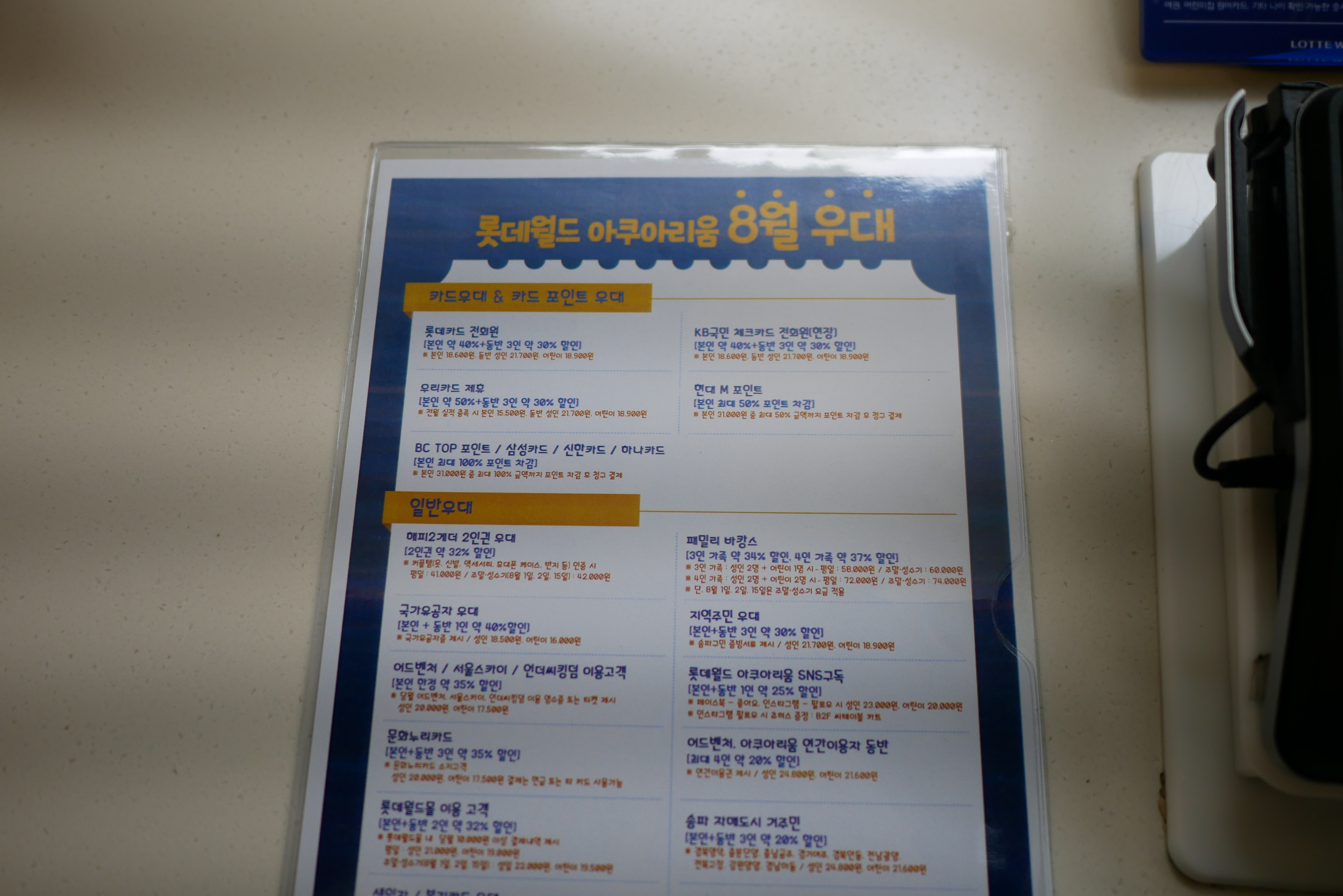 그리고 이곳은 현재 할인행사를 진행중인데요. 아마 대부분의 아쿠아리움이 할인을 하고 있기 때문에 방문하기 전에 할인 받을 수 있는 것들을 미리 알아가시는게 좋습니다. 저는 국민체크카드 할인을 받아서 본인 40%, 동반 1인 30% 할인을 받았습니다.