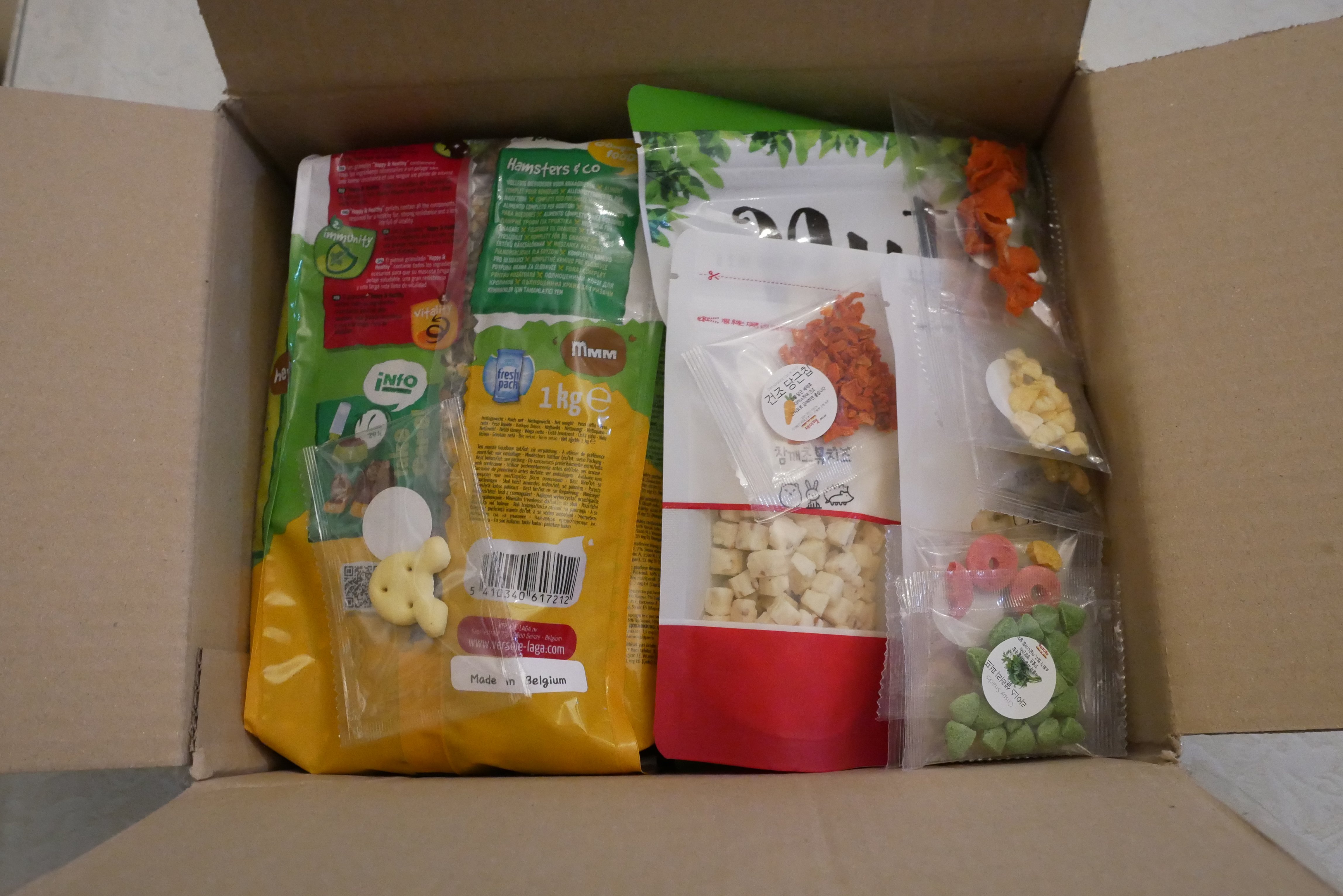 큰 상자에 가득 먹이가 담겨왔습니다. 다양한 먹이를 주문해서 총 3만원이 조금 넘는 가격이였고, 3만원 이상부터는 무료배송이기 때문에 이것저것 막 담았어요.