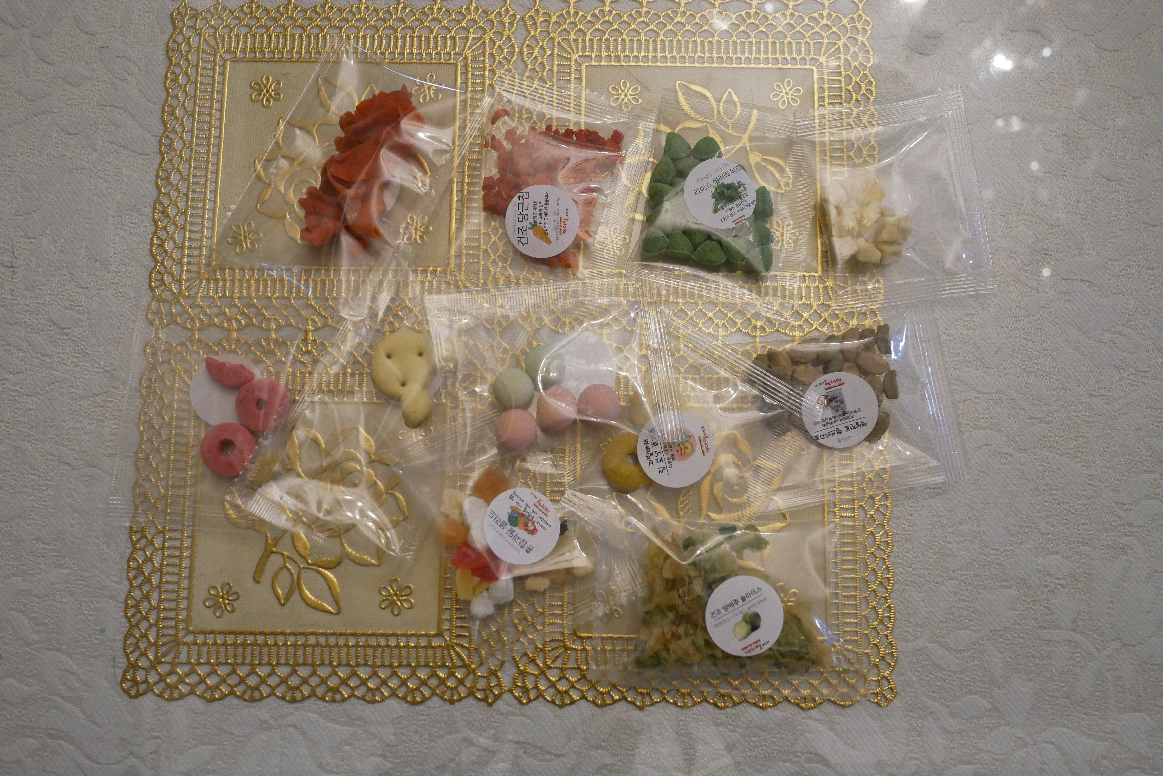 그리고 서비스로 보내주신 사료들입니다. 맛보기 용이고요. 대부분 건조과일과 쿠키류였습니다. 건조과일 같은 경우 보관하기 어렵고 대용량으로 사면 버리는게 더 많아서 이렇게 서비스로 받으면 기분이 정말 좋아요. 소비자들이 원하는 것을 잘 알고 있는 것 같아요. 제이팻이라는 곳 처음 주문해봤는데 괜찮네요 ㅋㅋ