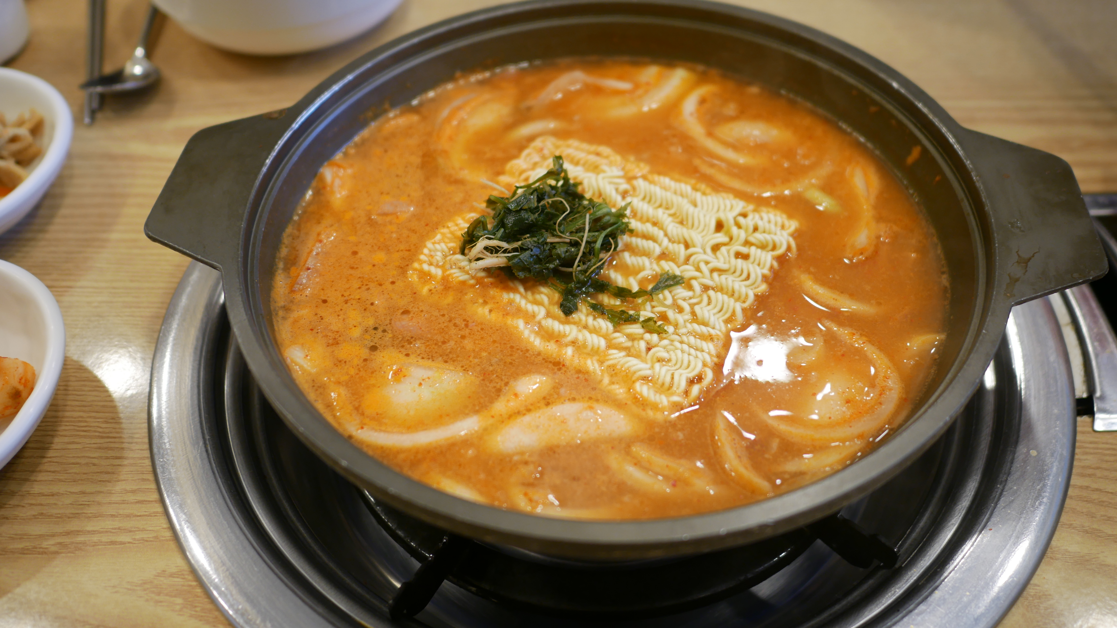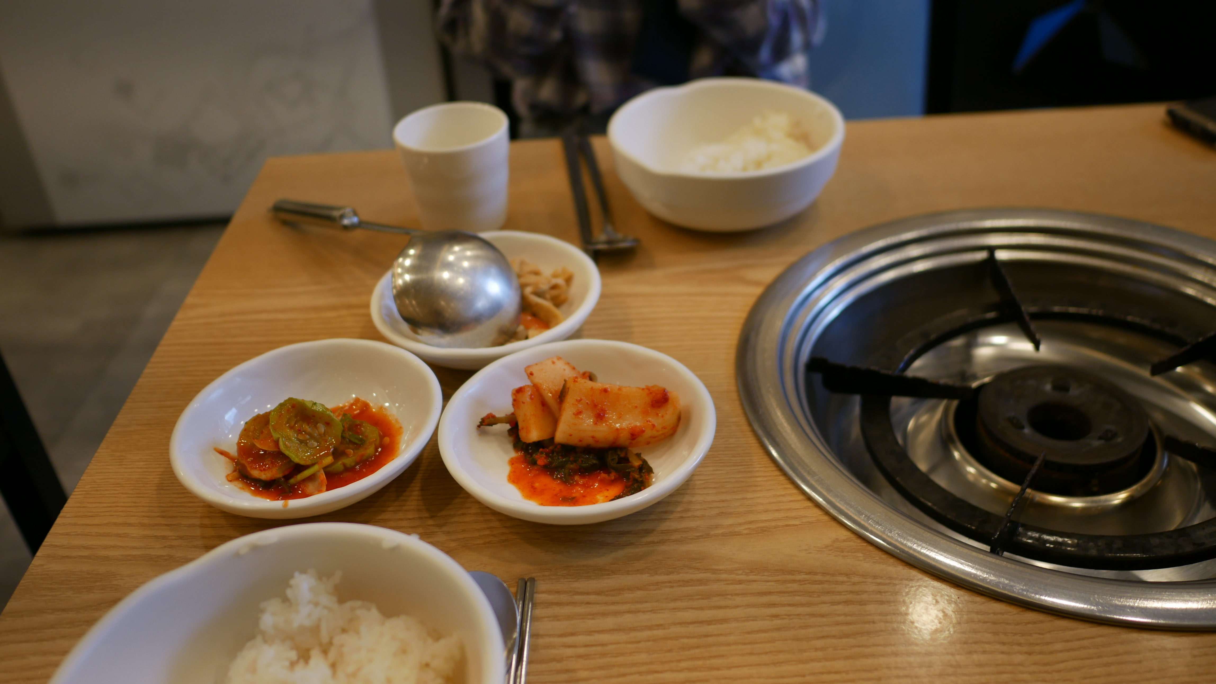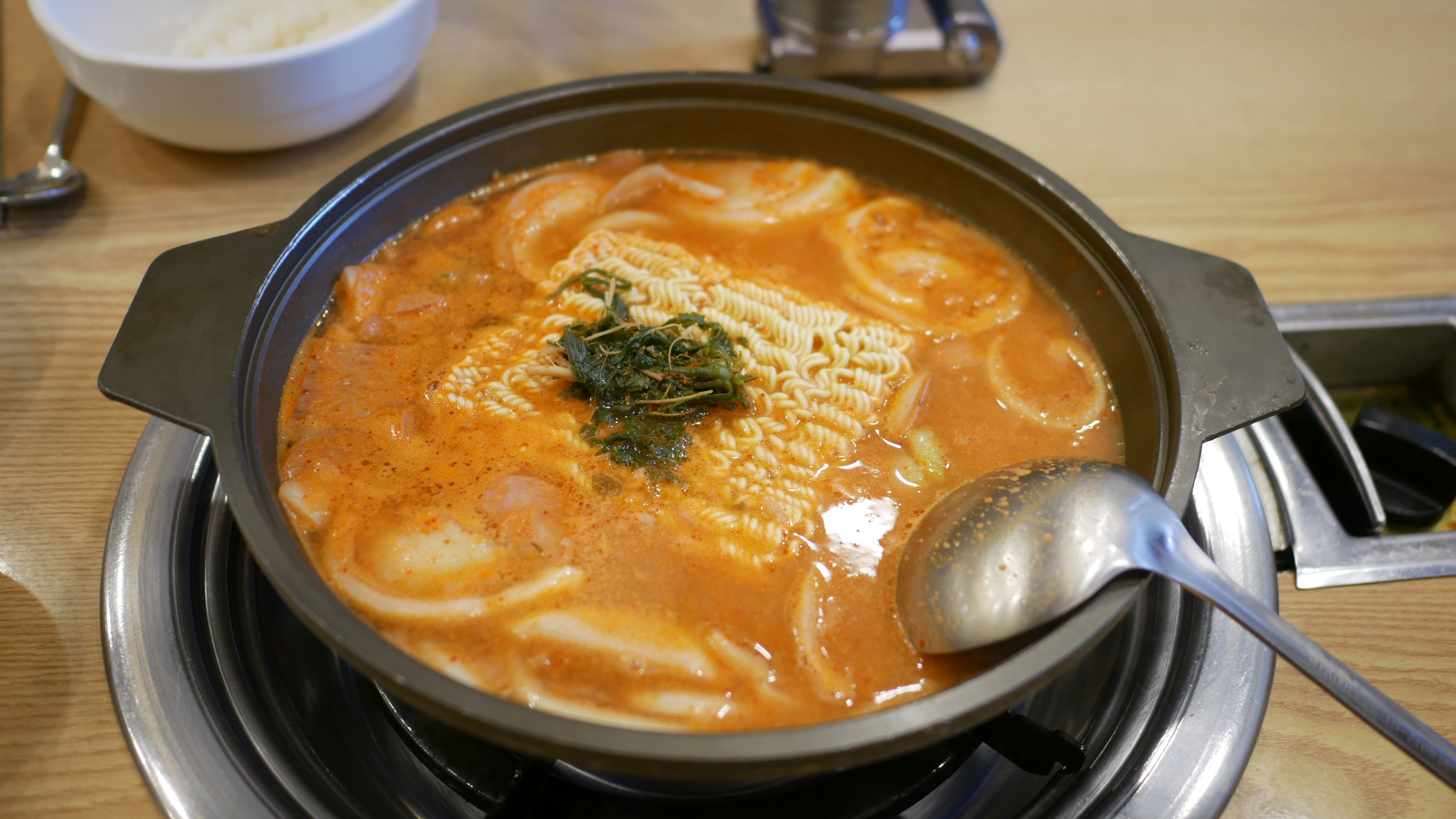 밑반찬은 어묵, 오이, 김치 이렇게 딱 3가지입니다. 그리고 반찬도 더 필요하면 가져다가 먹을 수 있습니다. 주문을 하고 몇분 지나지 않아서 부대찌개가 나왔습니다. 그리고 저희는 기본 부대찌개 2인분에 라면사리 1개를 추가했습니다. 부대찌개에는 밥이 포함된 가격입니다. 생각보다 양이 많기 때문에 굳이 라면사리를 추가하지 않아도 됩니다. 하지만 라면사리만의 특별한 맛이 있긴 하죠 ㅋㅋ..