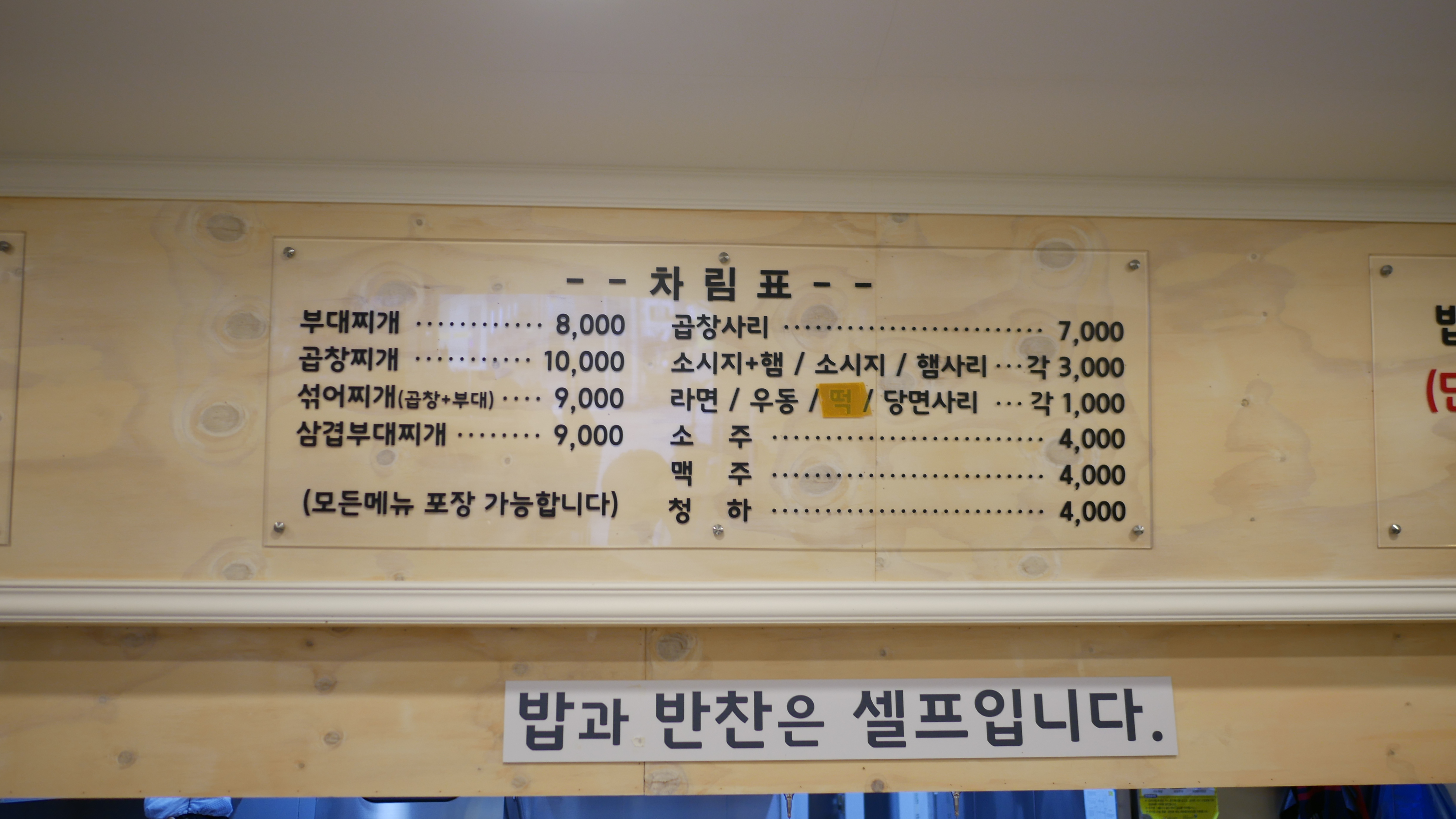 메뉴는 그대로이지만 가격이 조금씩 올랐더라고요. 마지막에 방문했을때 부대찌개 1인분에 7000원이였던 것 같은데 지금은 8000원입니다. 그 외에도 곱창찌개, 섞어찌개, 삼겹부대찌개가 있고 모든 메뉴가 1000원씩 올른 것 같았습니다. 그리고 사리는 가격이 그대로인 것 같았어요.
