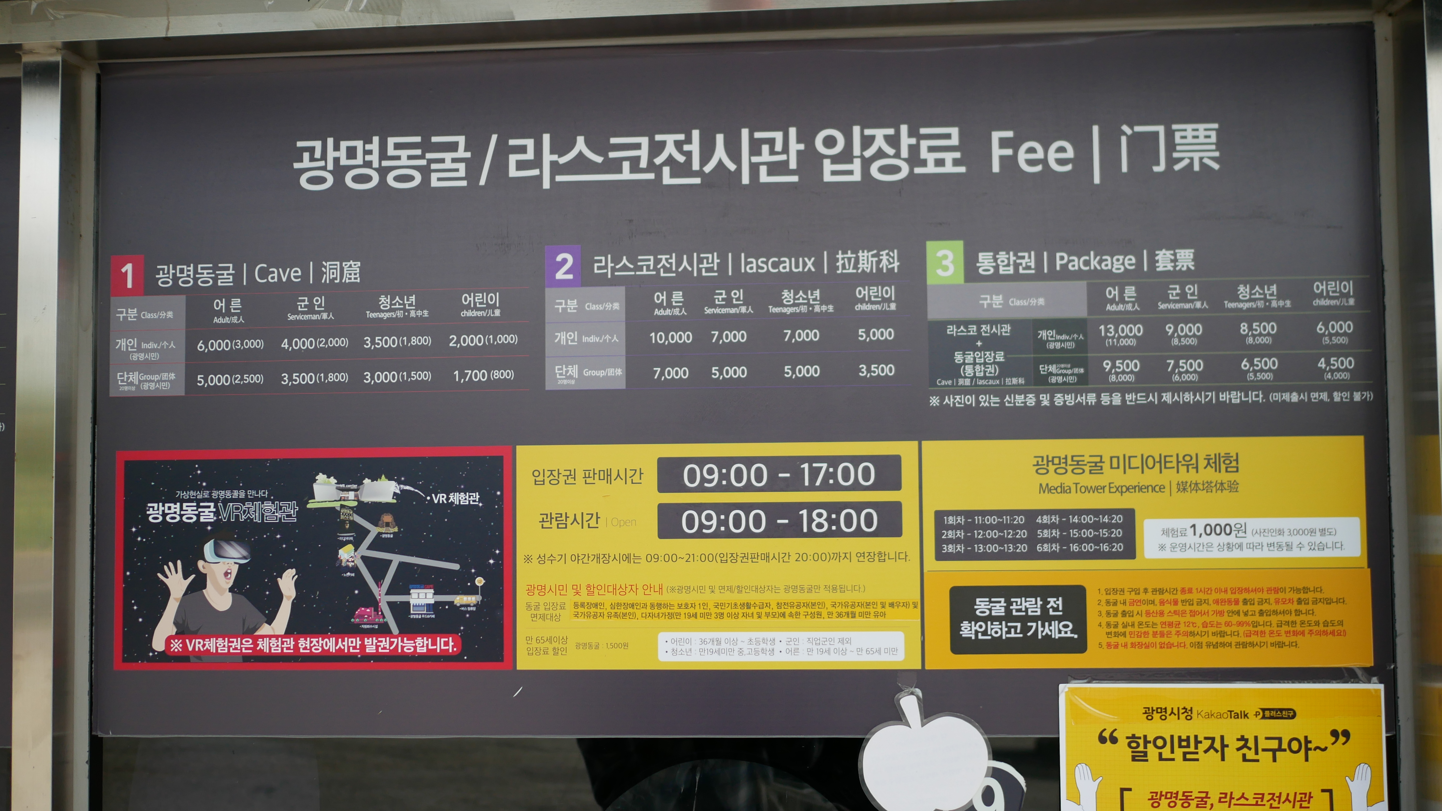 이곳은 동굴 말고도 레인보우팩토리나 VR 체험관도 함께 운영하고 있고, 다양한 먹거리도 즐길 수 있습니다. 하지만 개별적으로 요금을 지출해야합니다. 제 기억으로 통합권도 있었던 것 같은데.. 저희는 동굴 입장권만 구매했습니다. 가격은 성인 기준, 일인당 6,000원이고 광명시민의 경우 50% 할인이 들어갑니다. 저희는 카카오톡 플러스 친구를 이용하여 20% 할인 받은 가격으로 입장권을 구매했습니다.