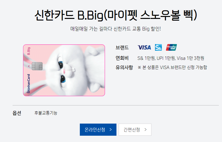 연회비의 경우 해당 상품은 VISA 만 신청이 가능하기 때문에 13,000원의 연회비가 나가게 됩니다. 따라서 그만큼 혜택을 받지 못한다면 이득을 볼 수 없기 때문에 잘 비교하고 내가 이것을 쓸지 말지 선택해서 신청해야하는 것이죠.